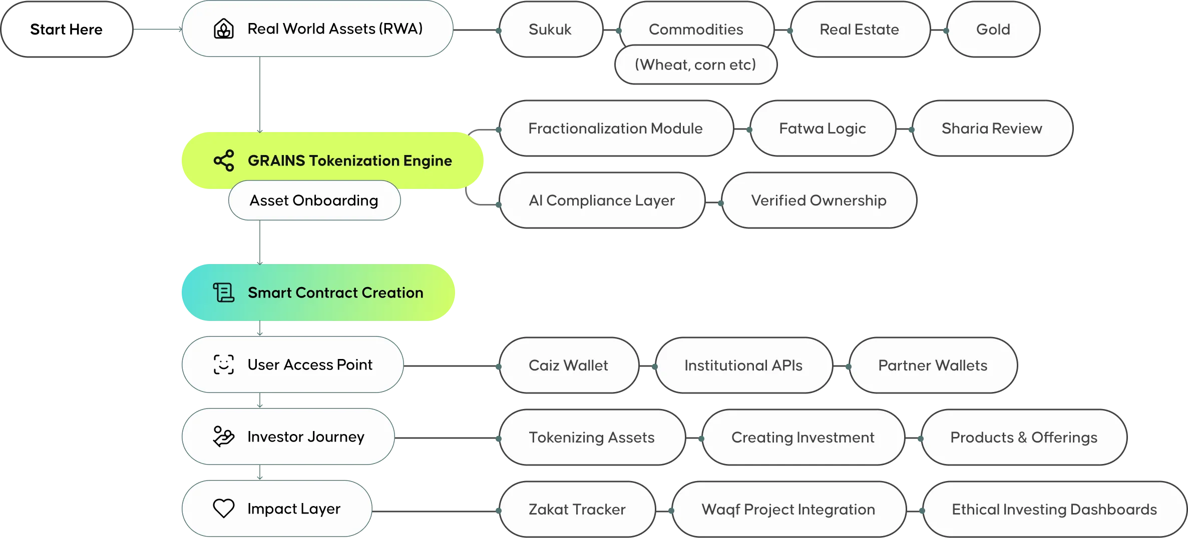With Caiz GRAINS, you can tokenize gold, sukuk, real estate, or commodities—on a secure, Sharia-compliant blockchain. Fractional ownership, real returns, and AI-backed compliance.